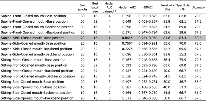 - The model with the best AUC value, in the range of 10–30 epochs, batch size 16–32, was created for each body position. Datasets 1–5 were used to divide the data into training data and test data. For each dataset, the AUC was calculated, the median and 95% confidence interval of the AUC for that dataset are shown, and the sensitivity, specificity, and accuracy of the median AUC are shown